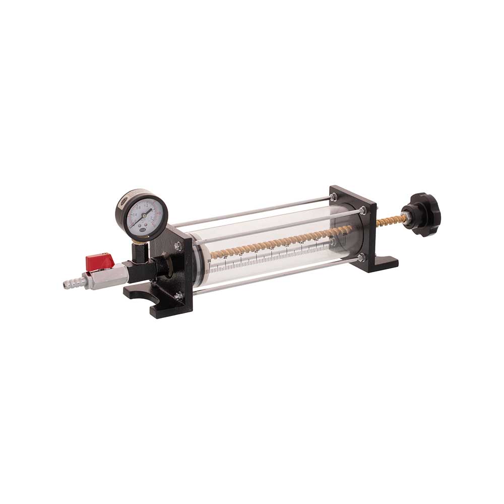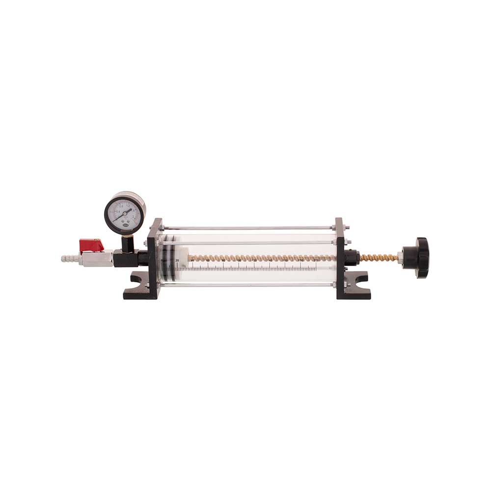 Superior version for accurate results. A transparent graduated cylinder with a piston is connected to pressure gauge. The pressure inside the cylinder can be adjusted by rotating the knob connected to the piston and can be read directly on pressure gauge.