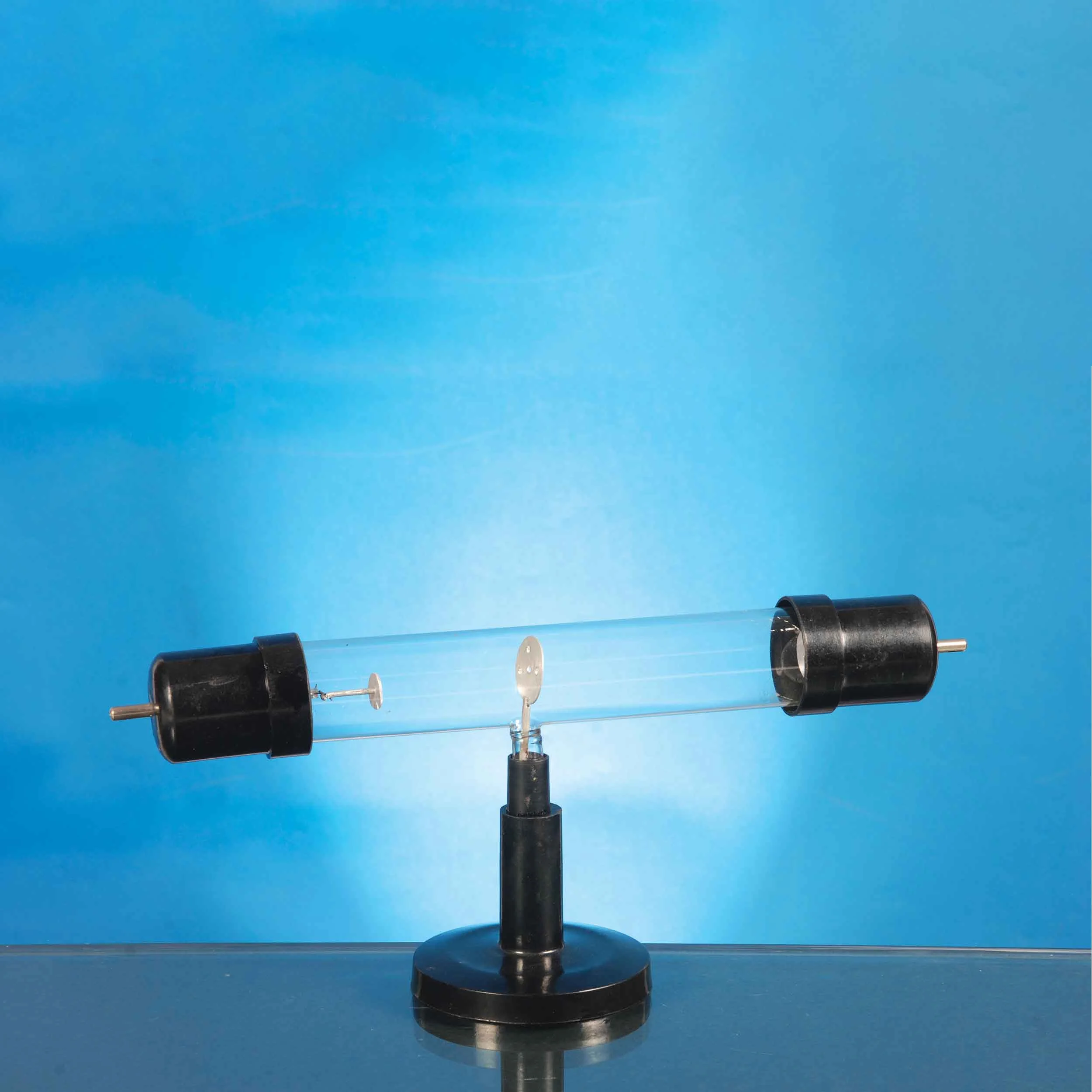 To show positive rays. Vertical type, with two fused discs at each end and a perforated cathode in the center through which canal rays pass. The space below the cathode is filled with characteristic glow of cathode rays and the upper portion has canal rays. A magnet brought near the upper portion will repulse the rays, showing the positive nature of the canal rays.