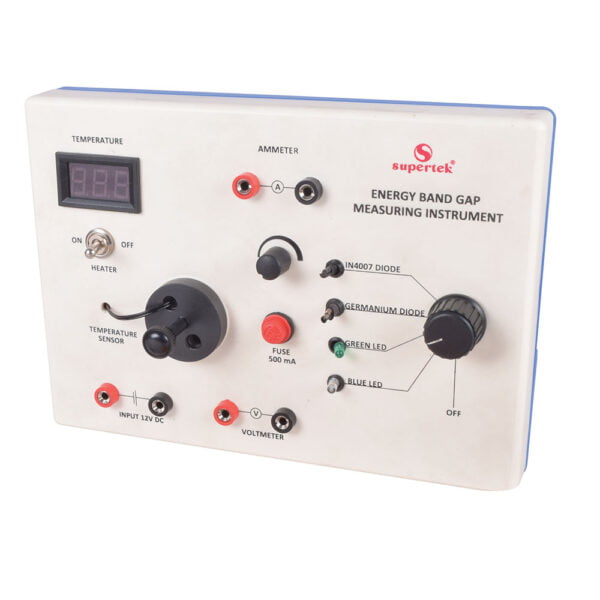 The energy band Gap Measuring Instrument is used to find the energy band gaps of the different semiconductor diodes and LEDs. The setup comes with a temperature meter, an in-built heating element with an ON/OFF toggle switch, and the following diodes and LEDs (IN4007, Germanium Diode, Green LED, and Blue LED) which can be selected by a rotary switch. Ammeter and voltmeter are connected externally to the instrument.
