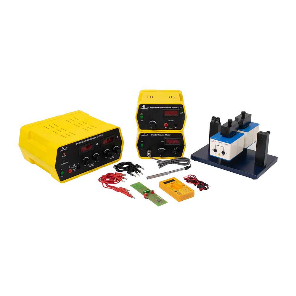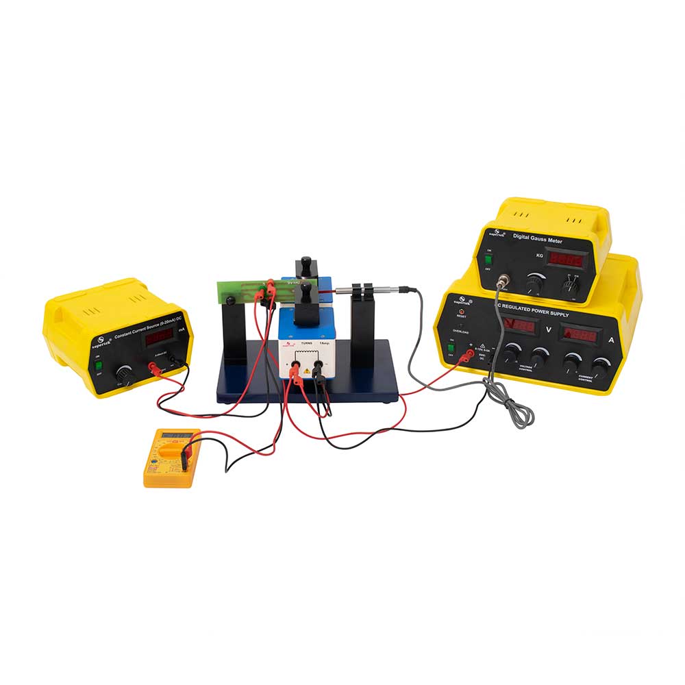 When a conductor through which current is flowing, is placed in the magnetic field, a potential difference is generated between two opposite edges of the conductor in the direction mutually perpendicular to both the field and the conductor. This potential developed is Hall voltage and the phenomenon is called Hall Effect. In the experimental setup, the crystal mounted on PCB is placed perpendicular to the pole pieces. A constant current is passed through the crystal using the constant current source. Magnetic field is produced by electromagnet operated by 0 – 12 V DC, 5 A power supply. Magnetic field intensity is measured by gauss meter with gauss probe. A Hall voltage thus produced is measured by the multimeter.