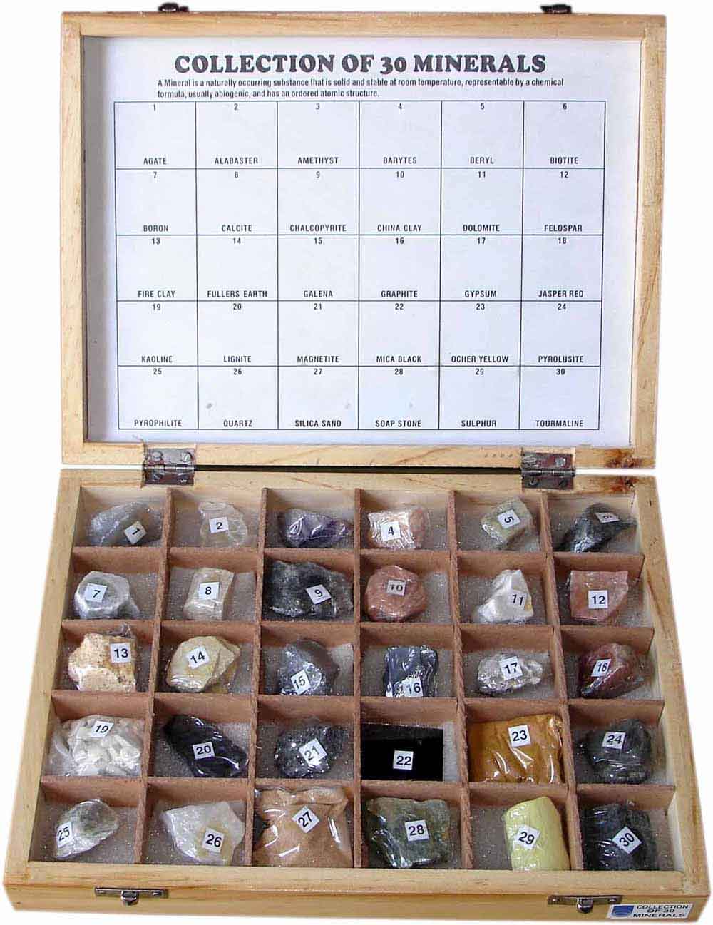 A quality collection of 30 mineral specimens, housed in a partitioned box for secure storage and organization. Each specimen is individually numbered and enclosed in a transparent plastic bag for easy handling and detailed examination.