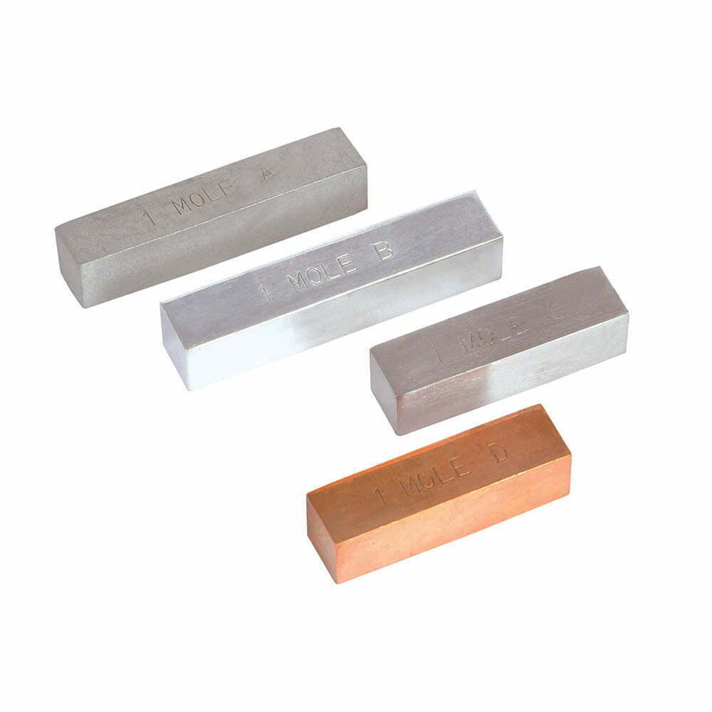 The four specimens in this set help the students to explain the concept of the mole. The Mole set contains four element specimens: Copper, Iron, Zinc, and Aluminium. Each sample contains one mole, 6.02 X 1023 atoms of the element.
