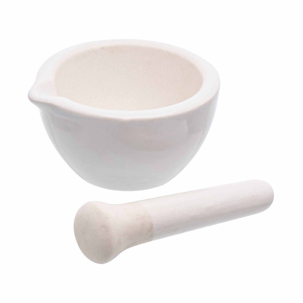 Porcelain, Mortar with spout, glazed outside except bottom, unglazed inside. Pestle unglazed to grinding surface.