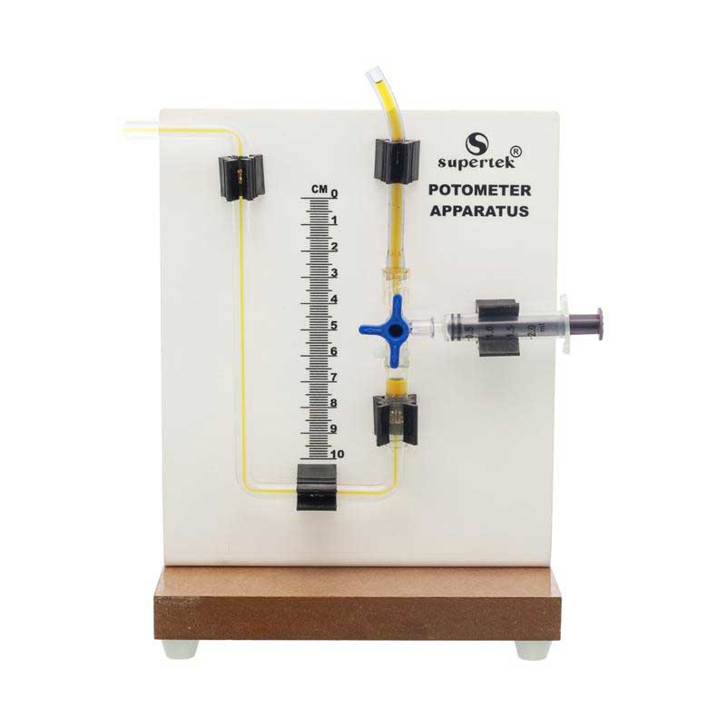 This Potometer Apparatus provides a simple and effective way to demonstrate plant transpiration by measuring water absorption. The transparent graduated scale allows clear observation, while the syringe and control valve make it easy to refill and regulate water flow. The complete setup is mounted on a sturdy base, making it highly suitable for laboratory demonstrations and plant physiology studies.