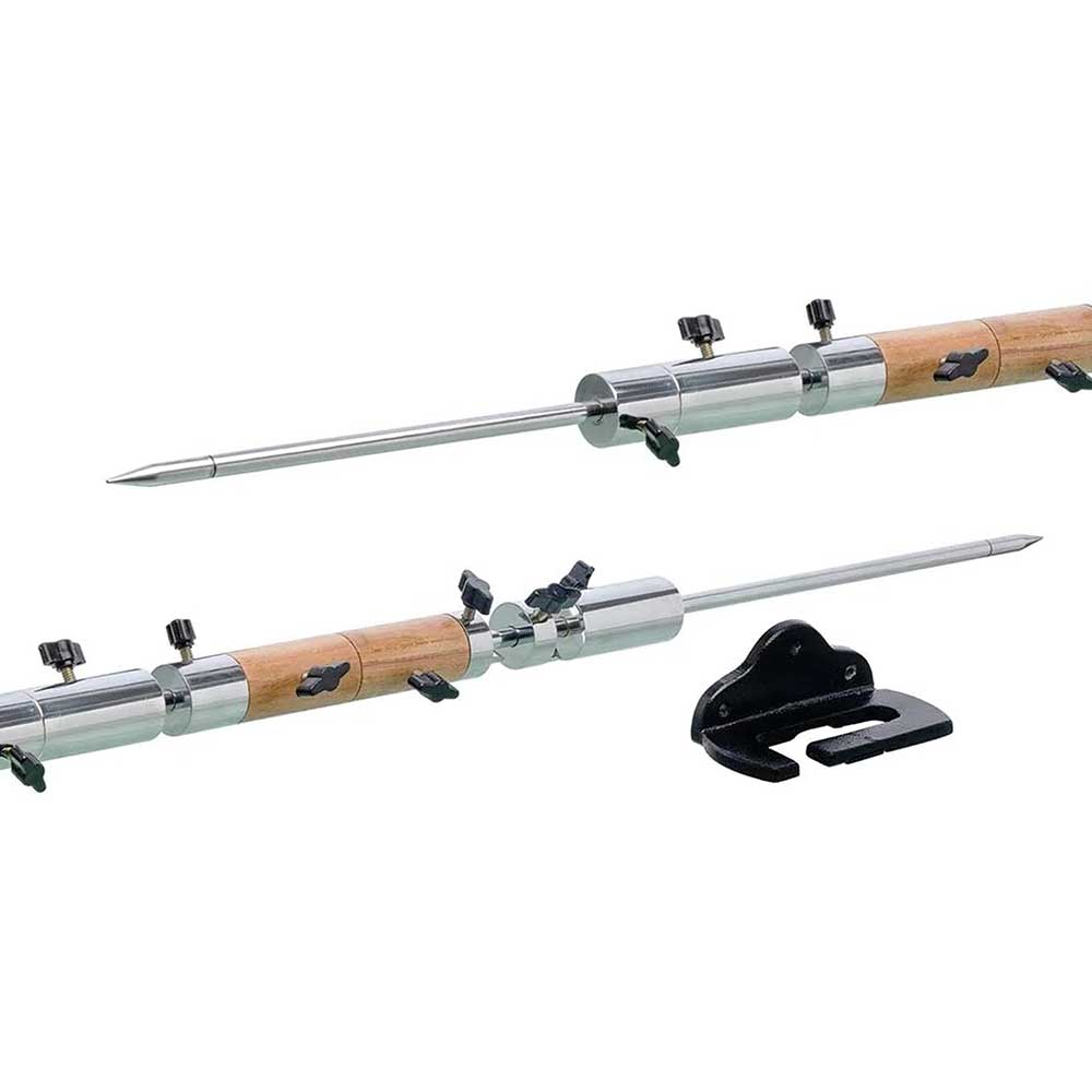 Kater’s pendulum includes a 120 cm electroplated brass rod (10 mm dia.) with small and large adjustable brass/wooden masses, two steel knife edges in adjustable holders, and a wall-mount support bracket.