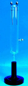 Made of glass, 26 cm long overall, narrowed to capillary width for 8.5 to 10 cm of length. Metal wires holding the electrodes are sealed through the ends and welded to metal caps, which have loops for connecting wires.
