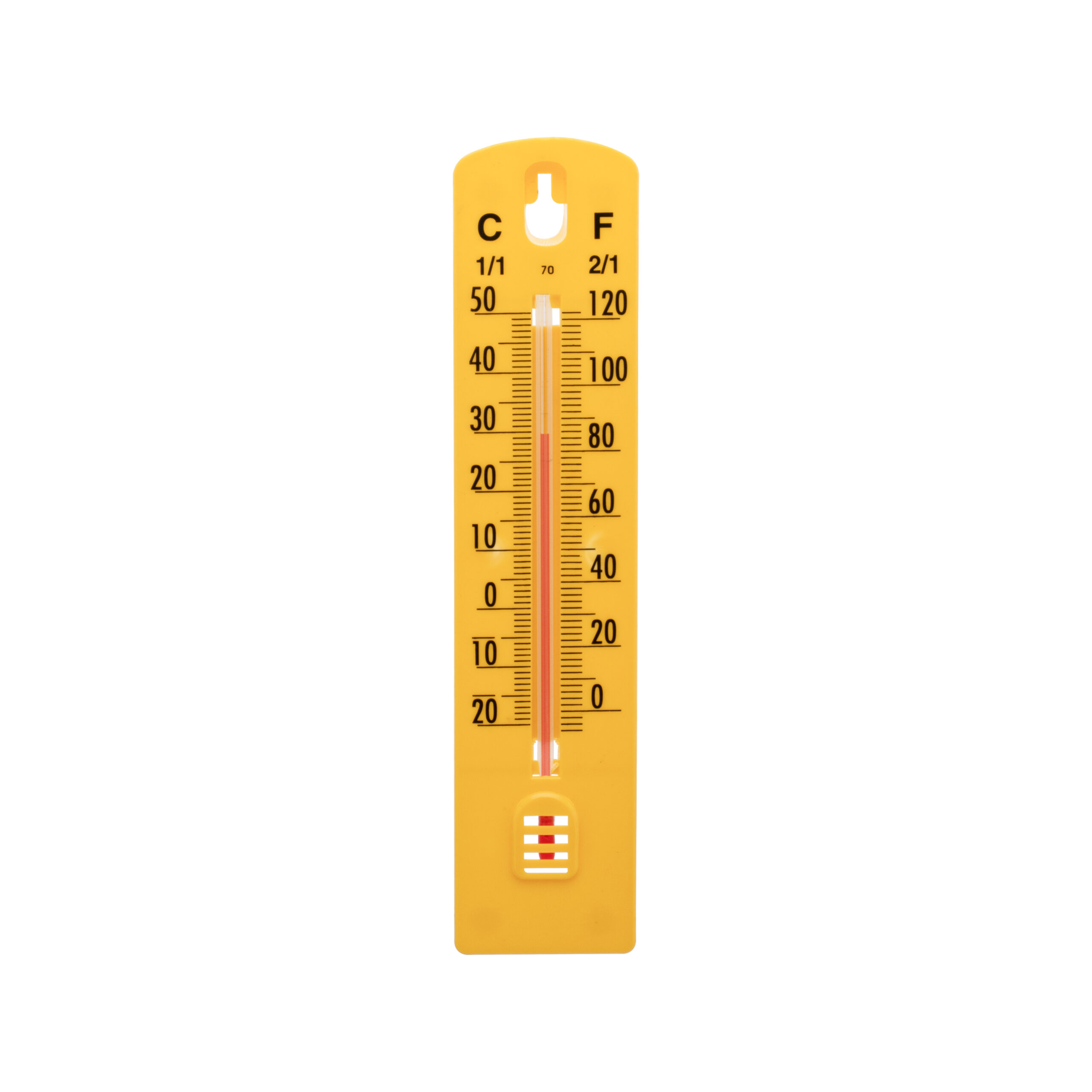 With scale reading from -20°C to 50°C x 1°C and 0 to 120°F x 2°F, with bulb guard, prismatic tube for ease of reading. Plastic base with screen printing.